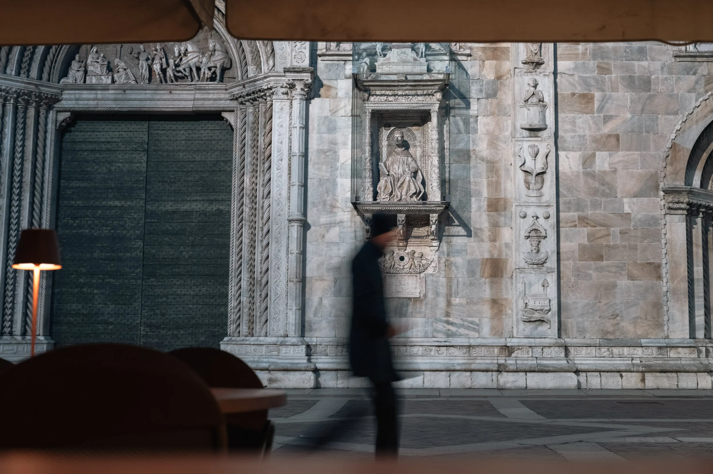 Above: A blurred passer-by near Como Cathedral on a winter afternoon