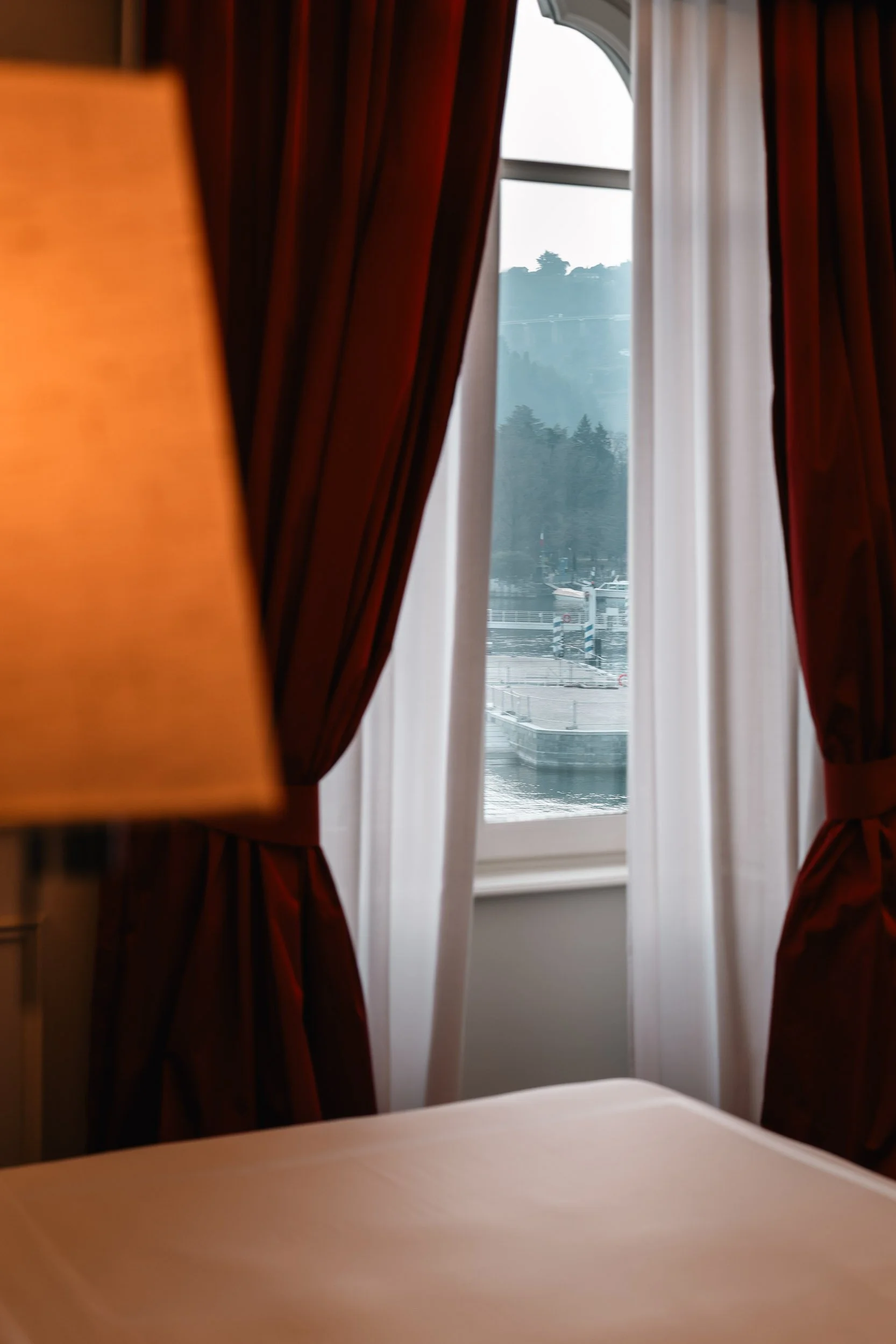 From inside, the day began at a distance. Curtains half-drawn, a lamp still lit, the lake already awake but unhurried.